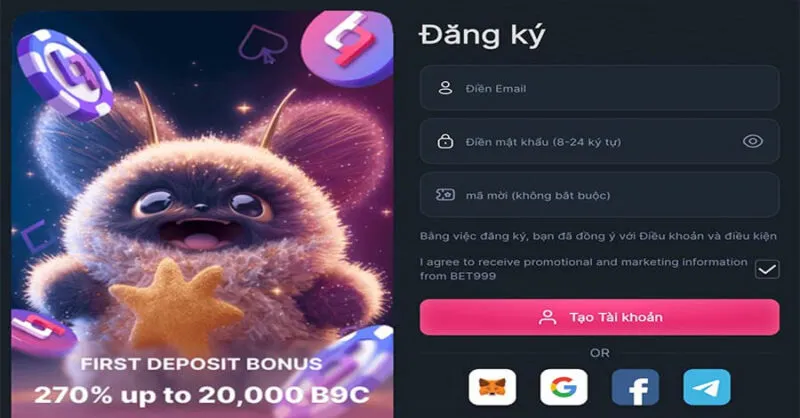 Để tiến hành tạo tài khoản tại Bet999 dễ dàng, anh em cần nhấn trực tiếp vào mục “Đăng ký” ngay góc bên phải màn hình. Tiếp đó nhập các thông cá nhân như: Tên đăng nhập, địa chỉ Email, Mật khẩu.