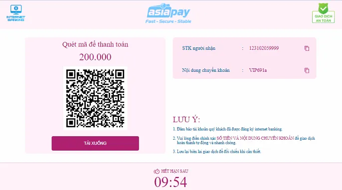 Sau khi chọn số tiền muốn nạp, bạn bấm nút chuyển tiền thì trang nhà cái sẽ điều hướng sang 1 trang có thông tin số tài khoản, số tiền cần nạp và những mã số hóa đơn.
